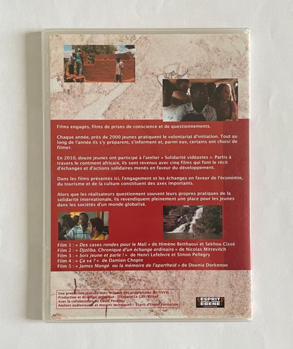 Esprit Ebène – Solidarité Vidéastes 2010, 5 expériences de solidarité au Mali, au Niger, au Burkina Faso et en Afrique du Sud (DVD) Catégorie : Vidéo Information Information DVD sorti en 2010. Réserver Produits similaires Irrintzina (DVD) Miroir de l’intégration en Rhône-Alpes (DVD) UNICEF – Les droits de l’enfant (Cassette vidéo) Christophe Picard – Commerce équitable, le café dans tous ses états (DVD)