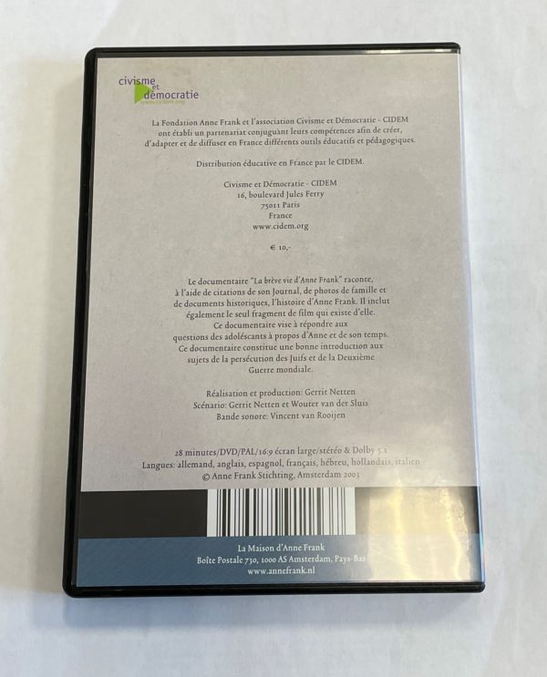 La brève vie d’Anne Frank (DVD) Catégorie : Vidéo Information Information DVD sorti en 2003 et réalisé par la Maison d’Anne Frank. Réserver Produits similaires Miroir de l’intégration en Rhône-Alpes (DVD) Plaidoyer pour une éducation dès le plus jeune âge en Afrique de l’Ouest (Bénin, Burkina Faso, Mali, Niger, Sénégal) (DVD) UNICEF – Les droits de l’enfant (Cassette vidéo) Même les nuages (DVD)